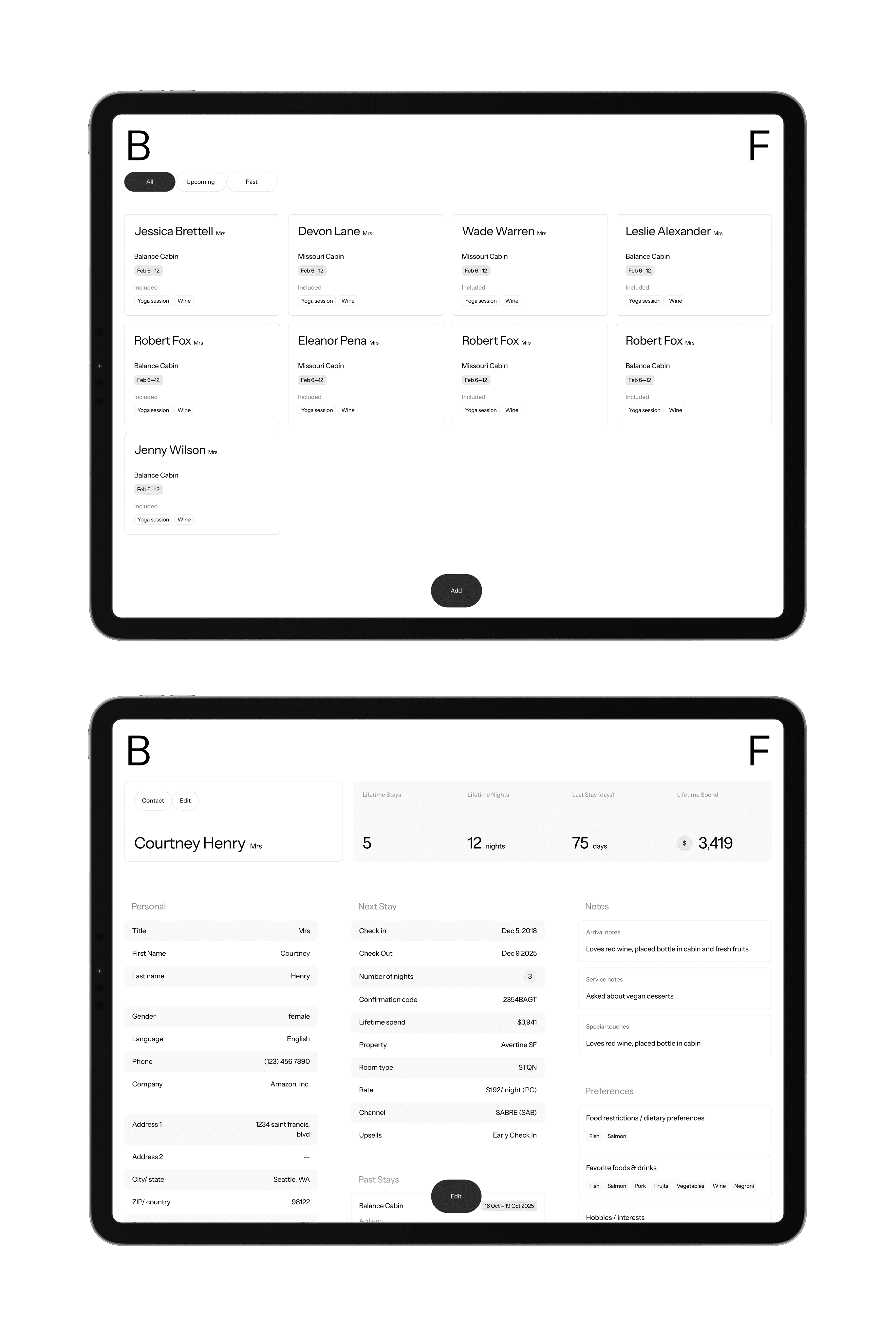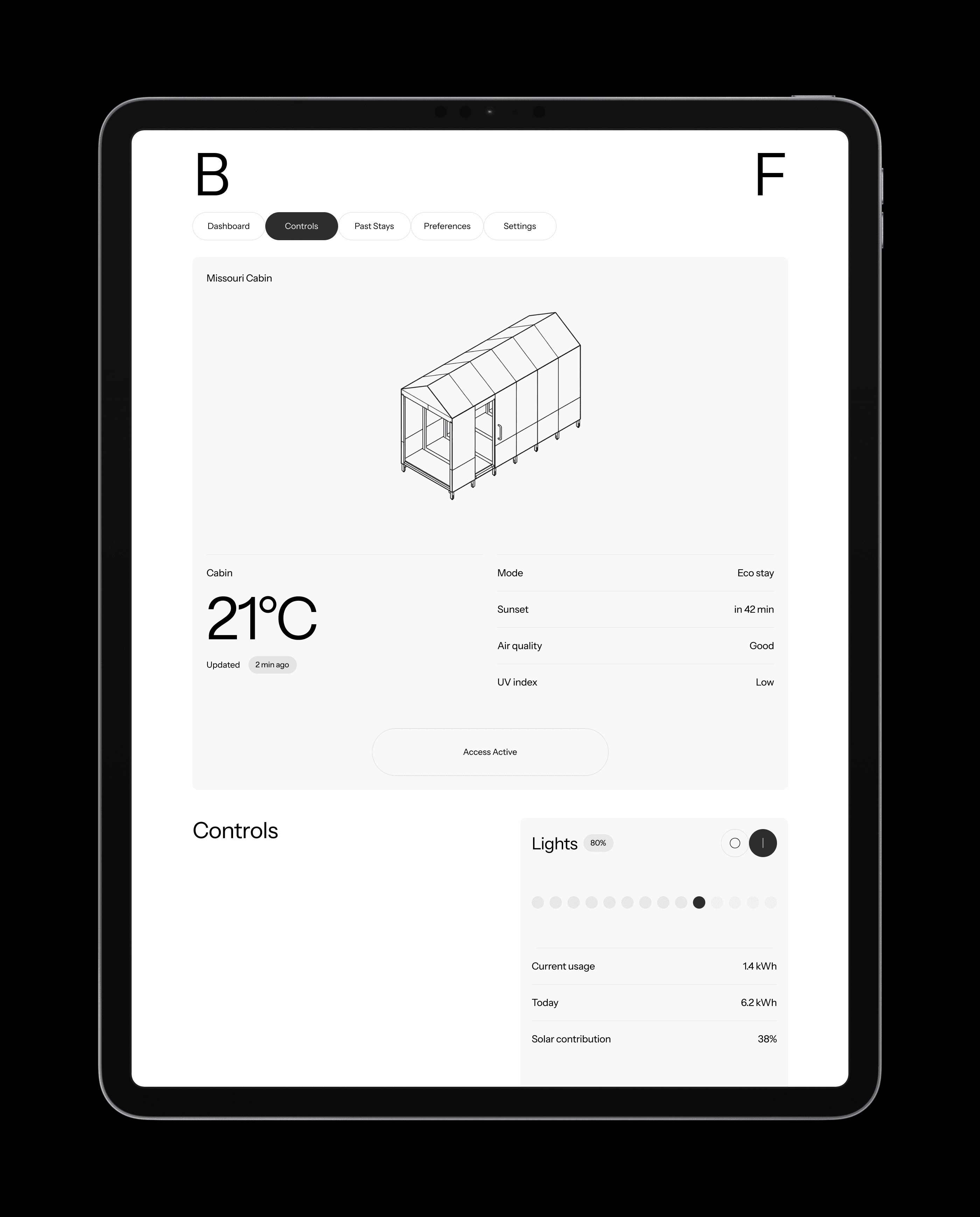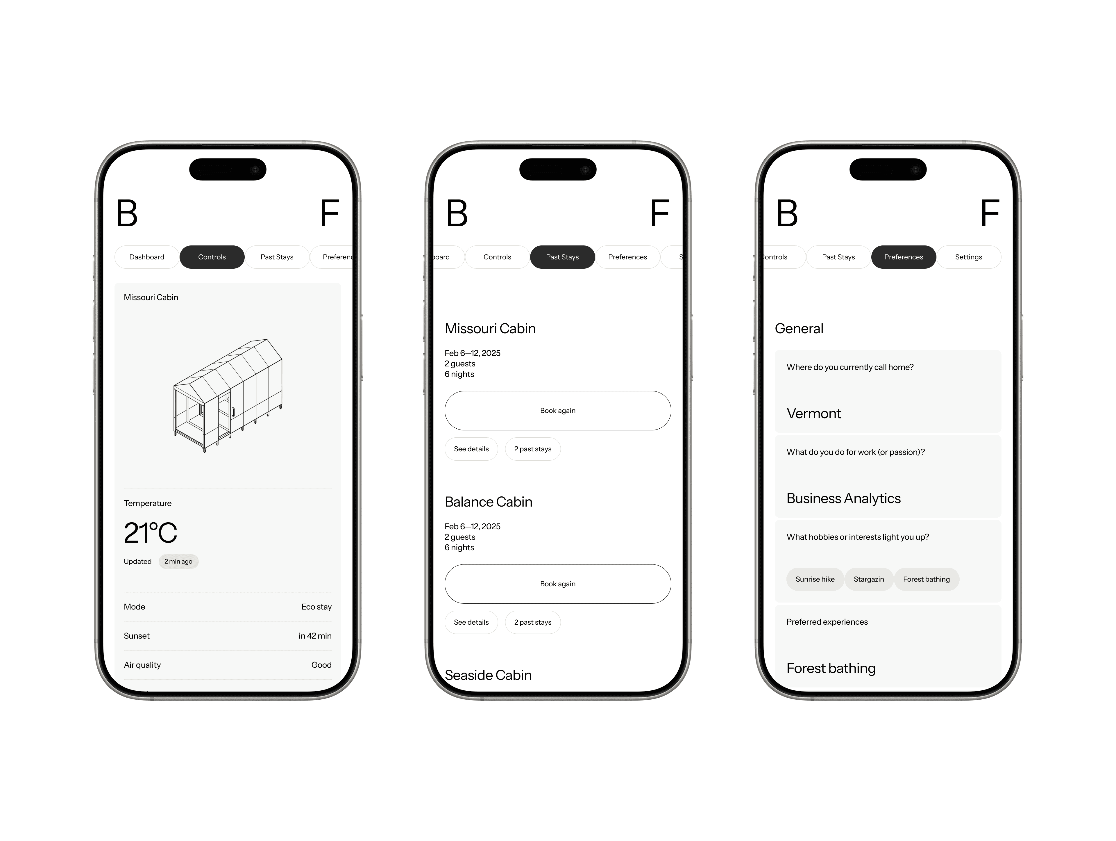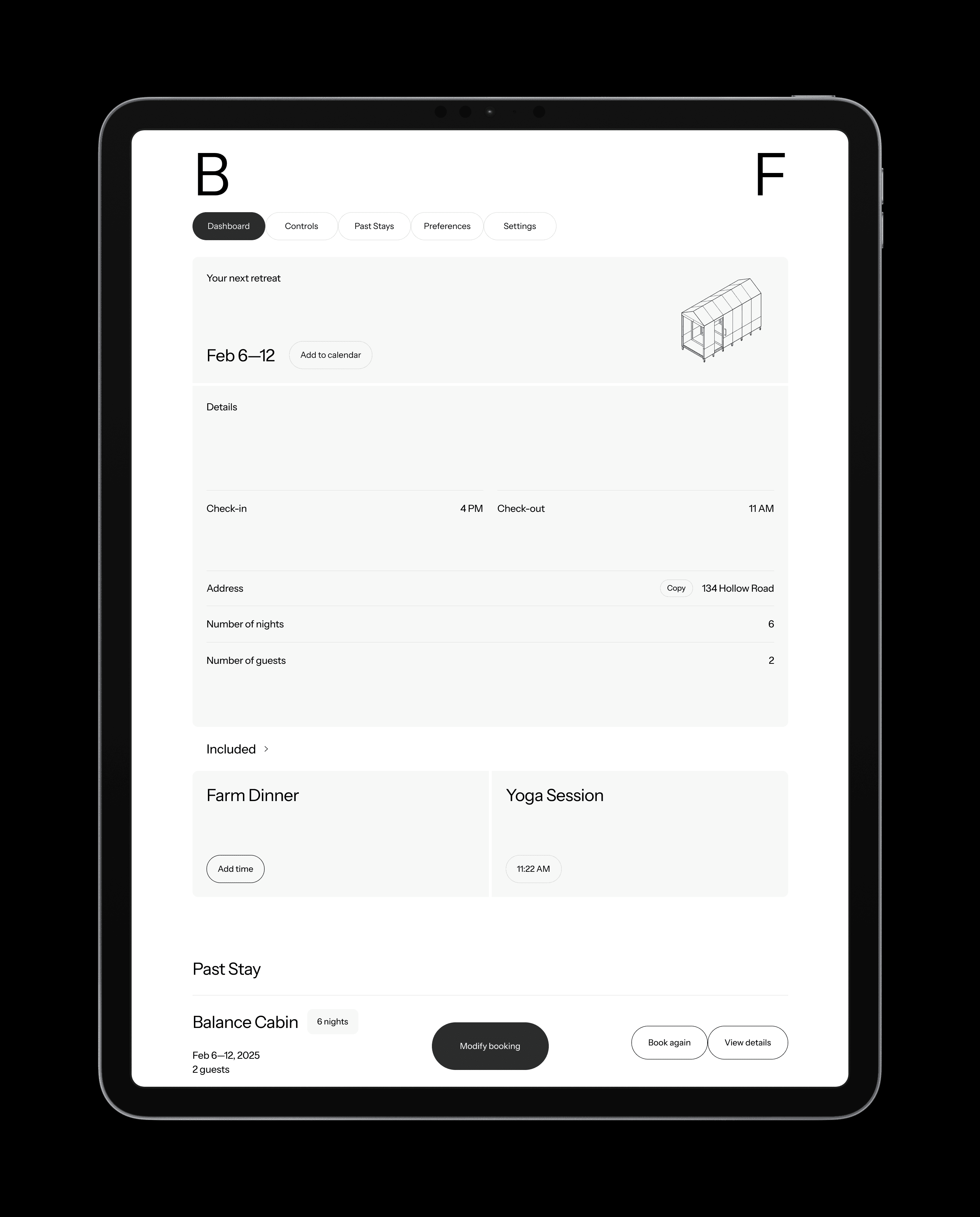 Before arrival, users can access their upcoming stay, review submitted preferences, and adjust details. On the day of check-in, cabin controls become active within the dashboard, allowing guests to manage temperature, lighting, eco modes, and access settings.