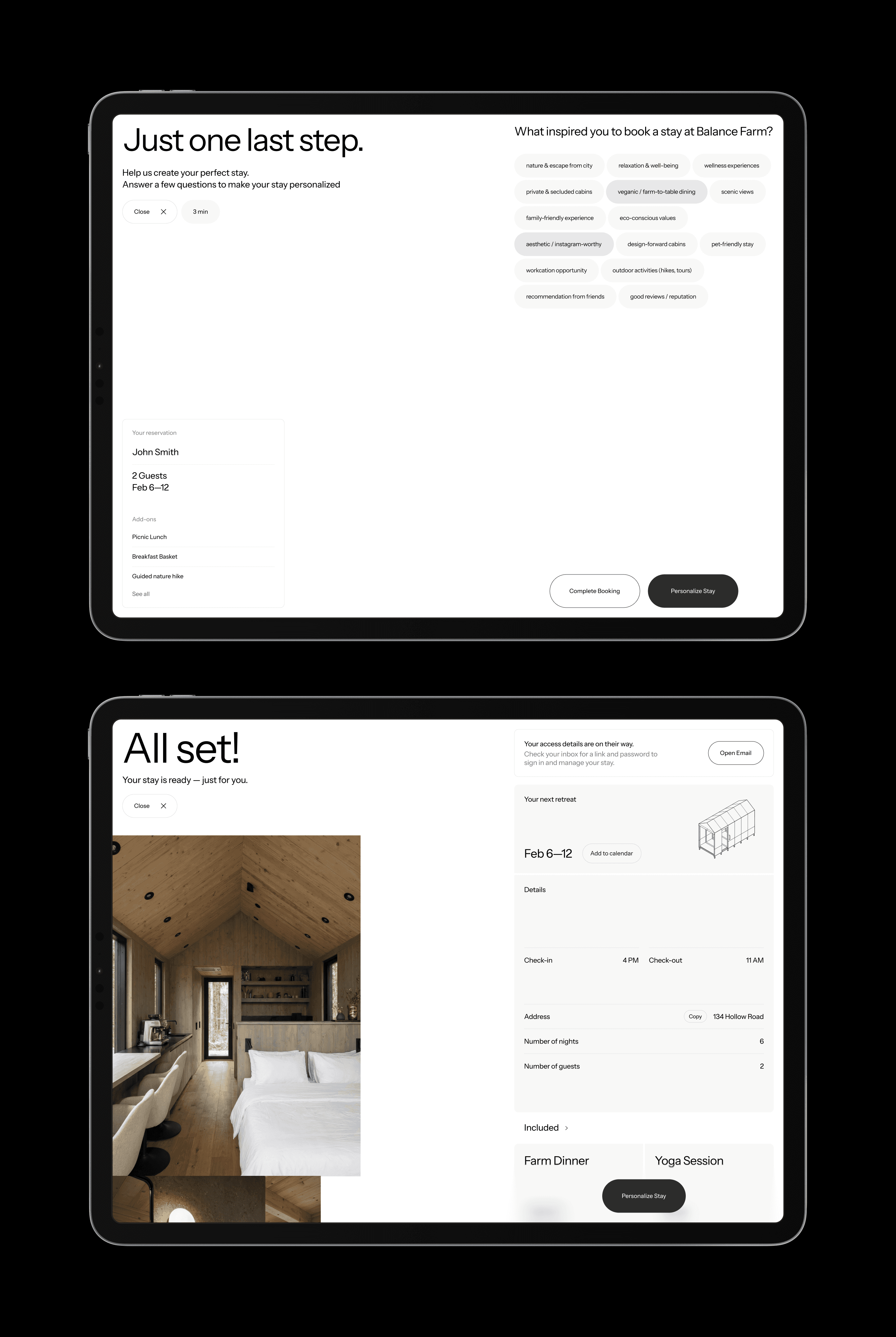 Balance Farm currently operates with a single cabin, with plans to expand into a multi-cabin retreat. The digital system was designed with this trajectory in mind.