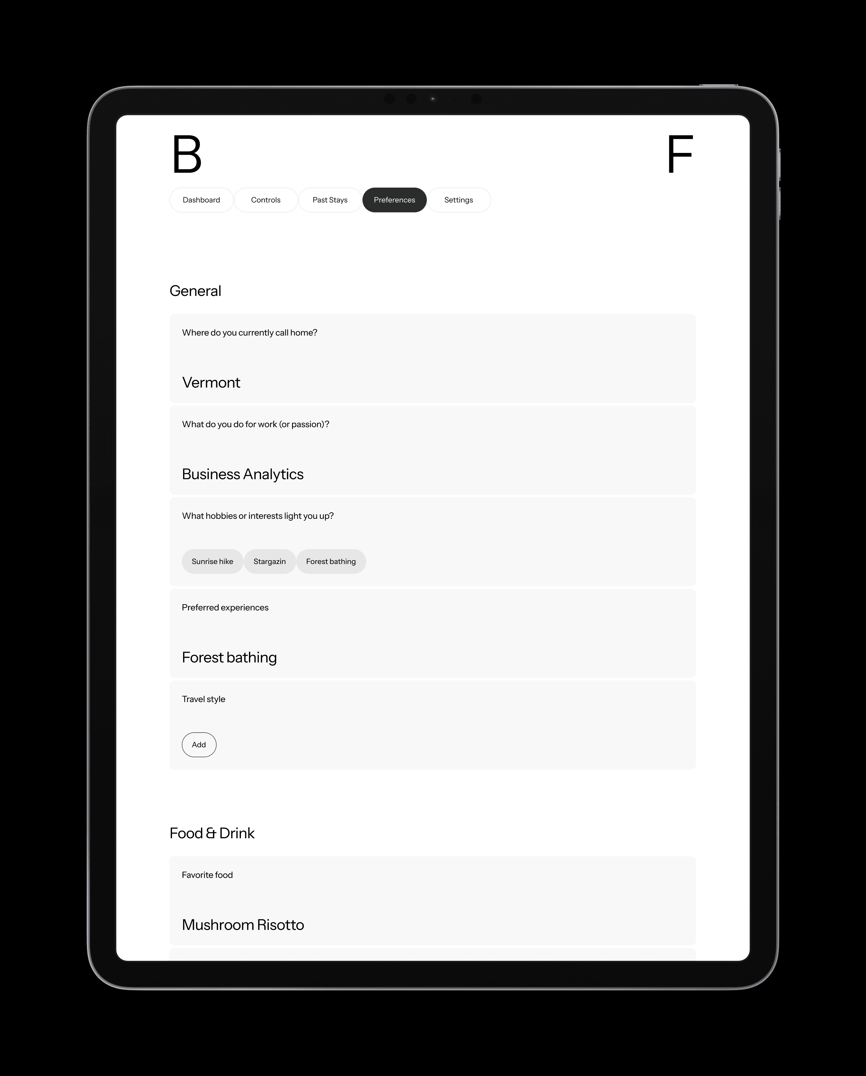A personalization survey is integrated into the flow. Guests can define general stay intentions prior to arrival. These inputs feed directly into the system and inform both operational preparation and in-cabin configuration.