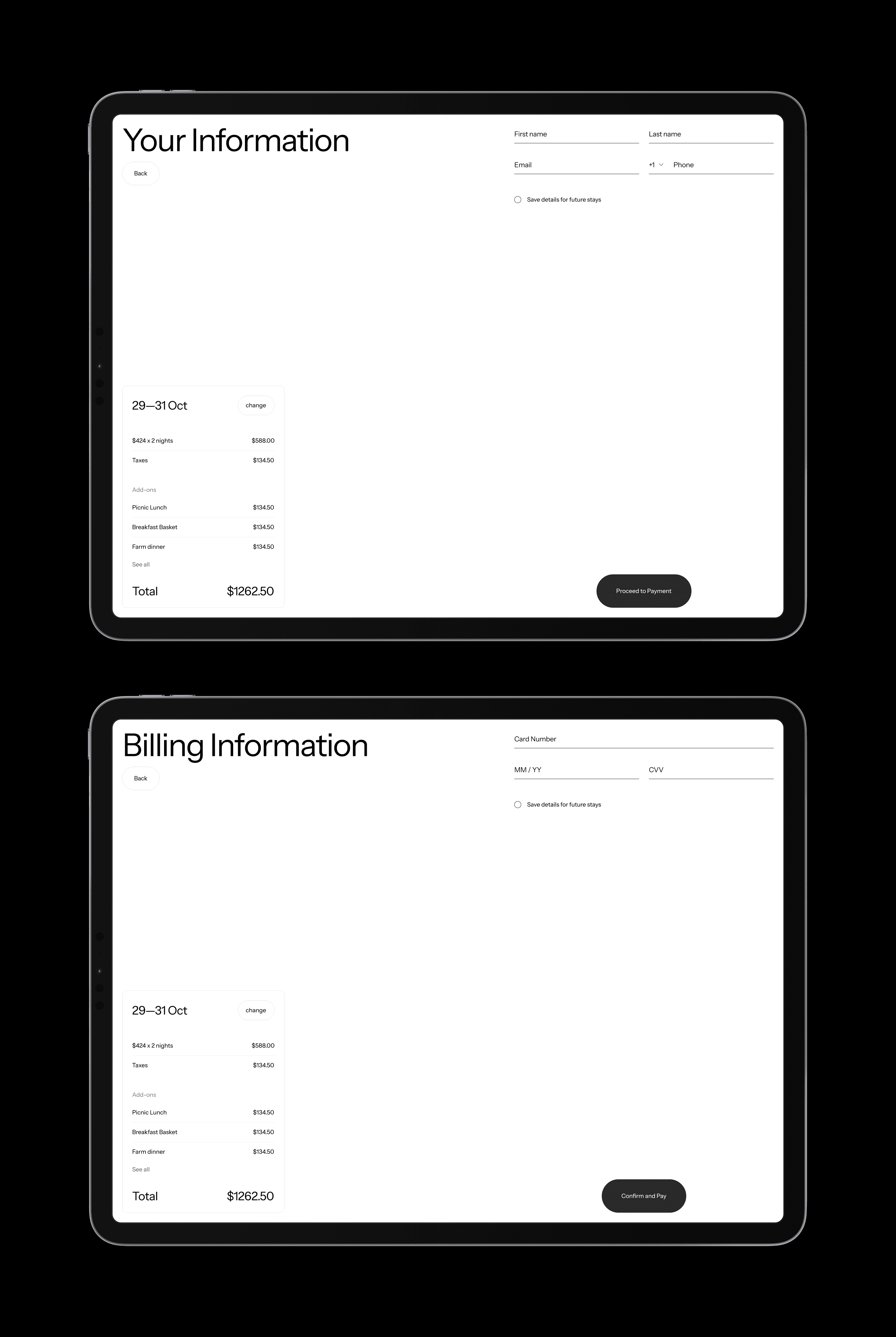The booking flow is designed as a structured, guided sequence that keeps decisions simple and transparent. Availability and pricing are clearly presented, with dynamic updates based on selected dates. The process is broken into focused steps to reduce friction and prevent drop-off.